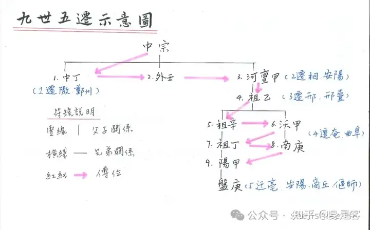 中宗(太戊)→(子)中丁(仲丁,迁都隞) →(弟)外壬→(弟)河亶甲(迁都相)→( 子)祖乙(迁都邢)→(子)祖辛→(弟)沃甲→(侄,哥祖辛儿子)祖丁→(堂弟,叔叔沃甲儿子)南庚→(堂侄,堂兄祖丁的儿子)阳甲。