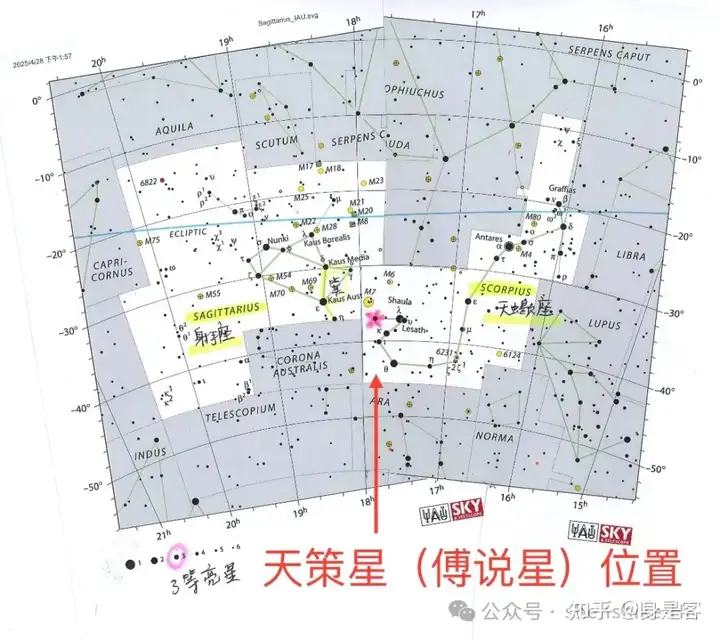 (图:天策星在哪里呢? 我只好又放下一切去研究了下,所以《史记》读得特别慢,老要去研究一下有的没的。天策星在箕宿边上。即射手座(人马座)和天蝎座的中间,为3等亮星。我自己剪拚了下星座图,应付着看吧。)