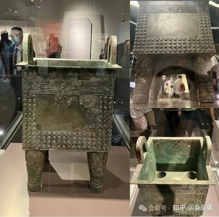 鼎身和足饰有饕餮纹。我趴着钻到它的下面去看,底部有十字型像架子一样承力(右上)。 我又举高起手机俯拍(可怜我忙死了):四足是中空的洞,可以注物进内。不知道怎么清洗足孔。)