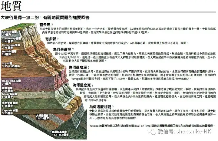 6500万年前,板块活动引起造山运动,把地抬高了1500至3000米,形成科罗拉多高原。特殊的又冷又热的气候环境(什么叫又冷又热?海拔升高,上面积雪,但下面还是沙漠。),导致科罗拉多河水量大增、携同各种砂石冲撞、切割岩石。而沙漠气候,又特别干燥,岩石土壤极易风化。上游跟下游的落差,以及,河床左面右面的倾斜,600万年的侵蚀,造就了大峡谷。