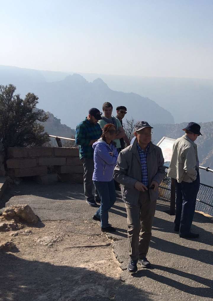 在导游的各种花式恫吓下,我基本上不敢靠近边沿去看风景,大峡谷上千米深,没有看到过底,大约只能看到三分之二的地方。Dan一路跟着我,也是规矩安份。直到我们的团友,年轻的一对,女的居然就直接坐在悬崖边上,脚簜在半空,拍照。看得我也跃跃欲试,回头目示了Dan几次,可Dan一脸的不配合,抱着臂、摇头说:太危险了。我很快就惊醒了,确实不值得冒险趋前了去拍照,容易乐极生悲。地上碎沙小石,人会不会滑下去不说,一个趔趄,手机也容易拿不牢掉下去。