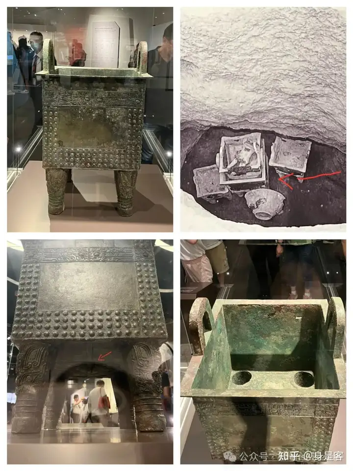 右上:是出土时情况,它居中, 上面还叠了一只鼎。