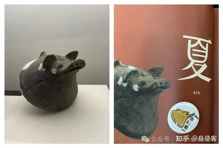 图4:陶猪头盖(2000年新密新砦遗址出土),这是一只会卖萌的好卡哇伊的猪头。场刊里重点推介,现场活动扭蛋机,我一抽就抽到了这只猪头章(懒训猪)。