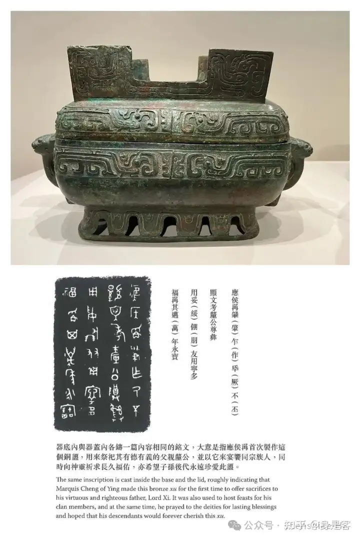 右: 盖子和内壁刻有:“晨肇贮用乍父乙宝尊彝(yí)即册"的铭文。(大致意思: 在晨地/国的即人史官(册)肇贮为父乙(家族)作此尊贵青铜宝器(彝))
